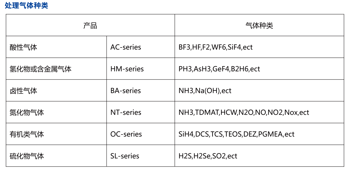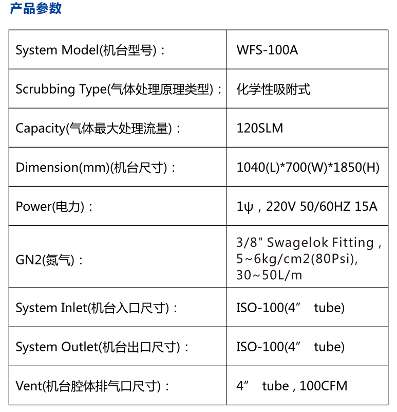 WFS-100F吸附式local scrubber 尾氣處理設(shè)備可處理氣體種類包括半導(dǎo)體、液晶以及太陽能等行業(yè)中蝕刻制程與化學(xué)氣相沉積制程中使用的特氣,主要包括SiH4、SiH2Cl2、PH3、B2H6、TEOS、H2、CO、NF3、SF6、C2F6、WF6、NH3、N2O等。