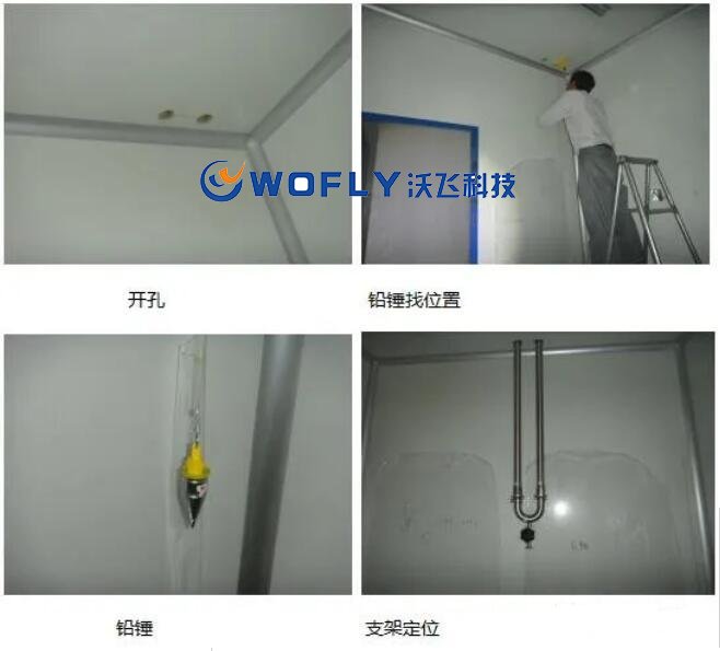 安裝時(shí),先在頂棚打出與管道同尺寸的孔洞,將固強(qiáng)套管固定在孔洞上,然后再將做好的支吊架自下而上的穿過(guò)頂棚,按照預(yù)設(shè)的高度,將支架固定在墻面上。